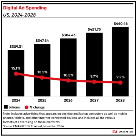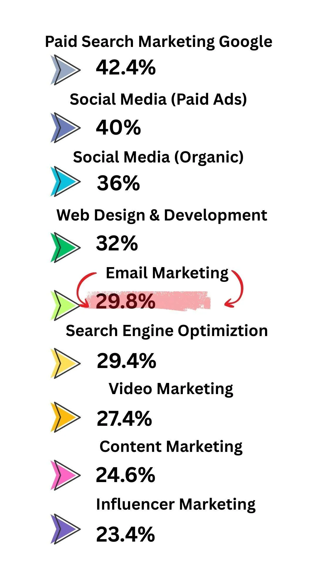 Don't be fooled by the percentage decrease shown by the red line. Companies are going to spend over $400 billion on digital advertising over the years ahead, and email will continue to be the cornerstone of their digital marketing efforts...which is projected to be about $42 million in 2028.